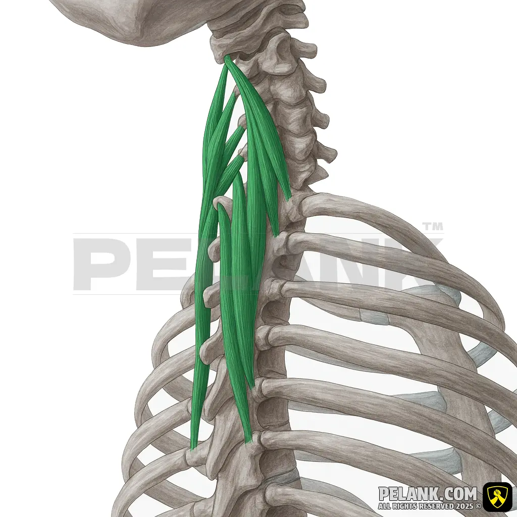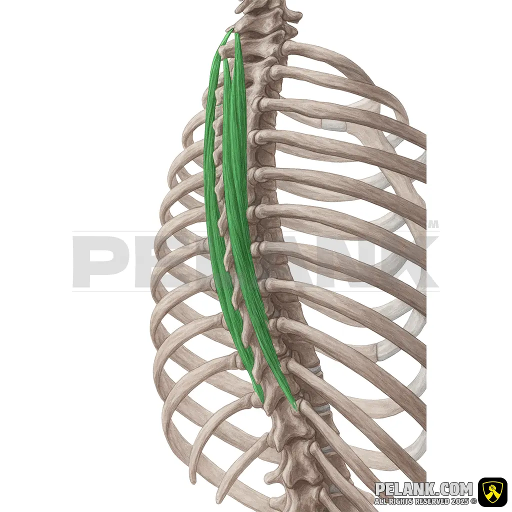 🟠 Anatomy: Originates from the thoracic vertebrae T1 to T12 and attaches to the adjacent ribs.